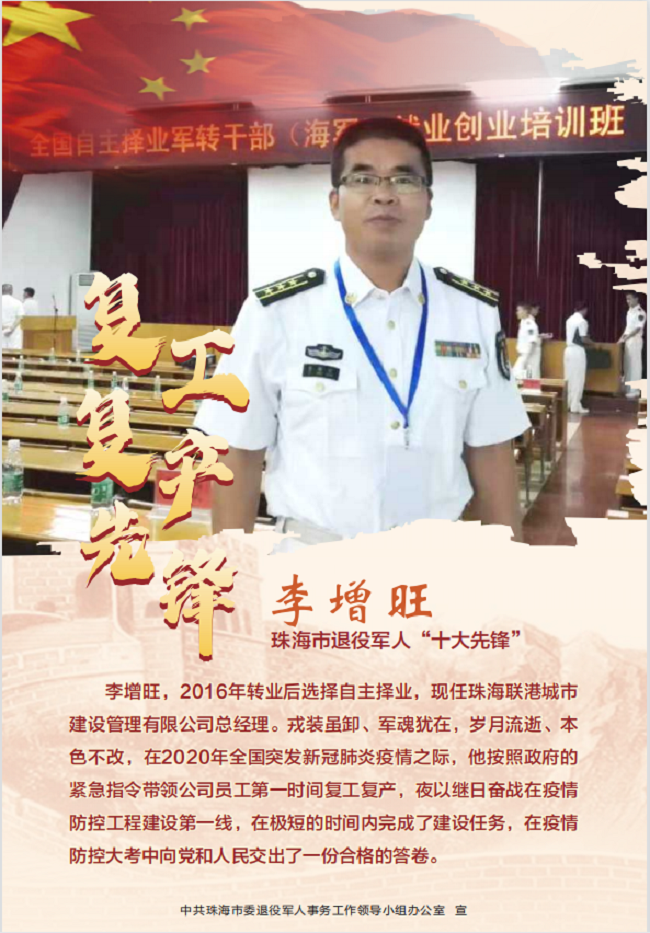 2022年4月26日,接珠海市委退役軍人事務(wù)工作領(lǐng)導(dǎo)小組辦公室通知,珠海聯(lián)港城市建設(shè)管理有限公司總經(jīng)理李增旺獲評(píng)“珠海市退役軍人十大先鋒—復(fù)工復(fù)產(chǎn)先鋒”。